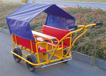 Der Wetterschutz zum nachträglichen Anbau für unseren Kinderkrippenwagen besteht aus einer stabilen Rundrohrkonstruktion und ist mit blauem Planenstoff überzogen. Das Dach kann z.B. auch als Werbefläche für einen Sponsor genutzt werden.