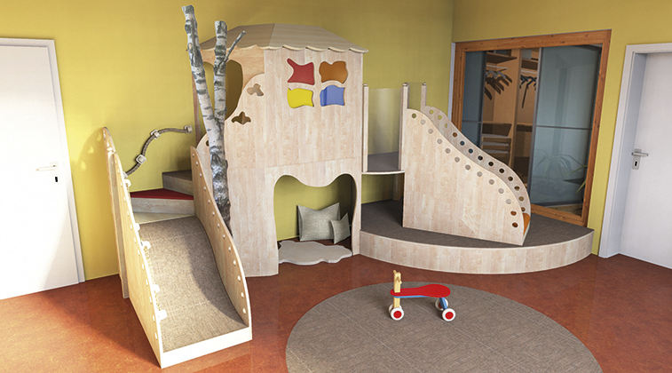 Auf individuellen Kundenwünschen haben wir für die Kindertageseinrichtung in Kiel eine Spielebene aus natürlichen Materialien kreiert. Ein echter Birkenstammes stellt das Highlight dar und bringt die Natur direkt in den Gruppenraum. Durch den Einsatz verschiedener Materialen werden beim Spiel auf dieser Spielebene alle Sinne angeregt. |