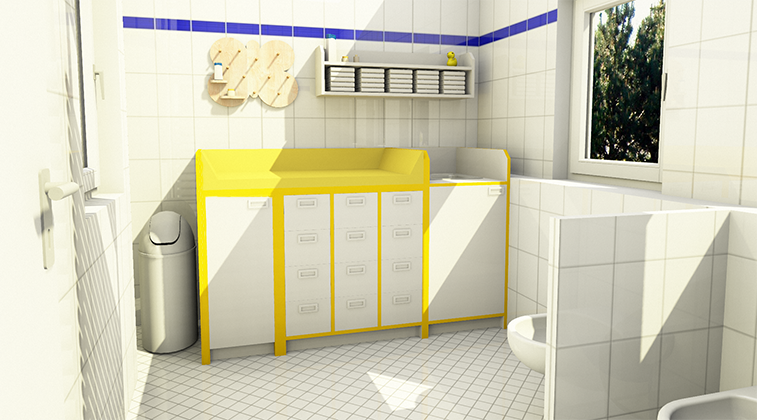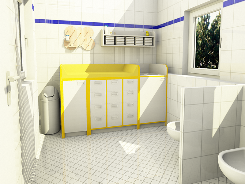 Im Bereich der Sanitäranlage wurde eine, für die intensive Nutzung geeignete, Wickelanlage installiert. Die ausgereifte Konstruktion unserer Wickelanlagen verhindert das Eindringen von Flüssigkeiten in das Holz und ermöglicht so eine lange Nutzung. Bei der Montage verwenden wir im Krippenbereich nur Wickelaufsätze mit den vorgeschriebenen Kranzhöhen, um das Herunterfallen der Kinder gänzlich zu verhindern.