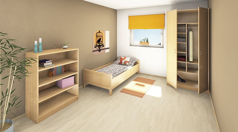 Bei der räumlichen Ausstattung der Zimmer haben wir uns an den Bedürfnissen der Studenten orientiert: ein zeitloser Stil und langlebige Materialien ermöglichen die Nutzung über viele Jahre hinweg. Zur Standardausrüstung der Studentenzimmer zählen ein Kleiderschrank, ein Bett und ein Bücherregal. Entsprechend der Anforderungen wurden die Möbel so konzipiert, dass eine vielseitige Verwendung gewährleistet werden kann. |