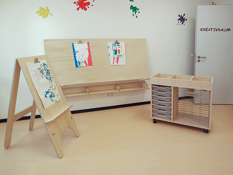 In Hackenheim wird es jetzt bunt. In der Kindertagesstätte „Kleines Ich“ gibt es einen separaten Raum um der Kreativität zu frönen. Diesen Raum haben wir mit allem Möglichen und Nötigen ausgestattet. Von Mal-Wand bis Staffelei ist hier alles dabei. Kreative Köpfe kommen hier auf Ihre Kosten. |